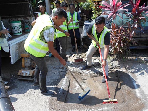 Tidak boleh. Bahan terlerai susulan tindakan memotong di sekeliling pothole perlu dibersihkan terlebih dahulu. Sekiranya keratan segi empat itu mendedahkan lapisan crusher-run atau lapisan asphalt sedia ada, tack coat gred RS-1K perlu disembur pada kadar 0.25-0.55 liter/m2 dan dibiarkan seketika ~ 30 minit. Pada masa yang sama, tack coat perlu disapu di bahagian tepi keratan lapisan asphalt (sekiranya tidak, rekahan mudah terbentuk di sekeliling kawasan tampalan). Hanya selepas itu, baru keratan segi empat itu boleh ditampal dengan premix.